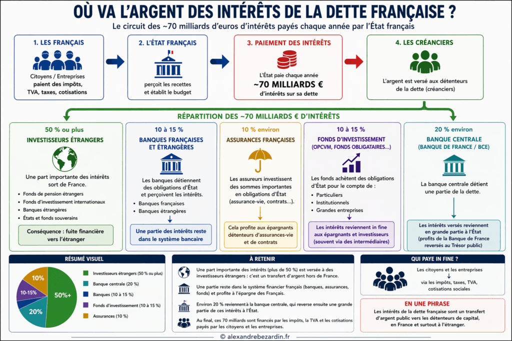 Cet article décrypte le circuit complet des intérêts de la dette française, à partir du visuel ci-dessus.